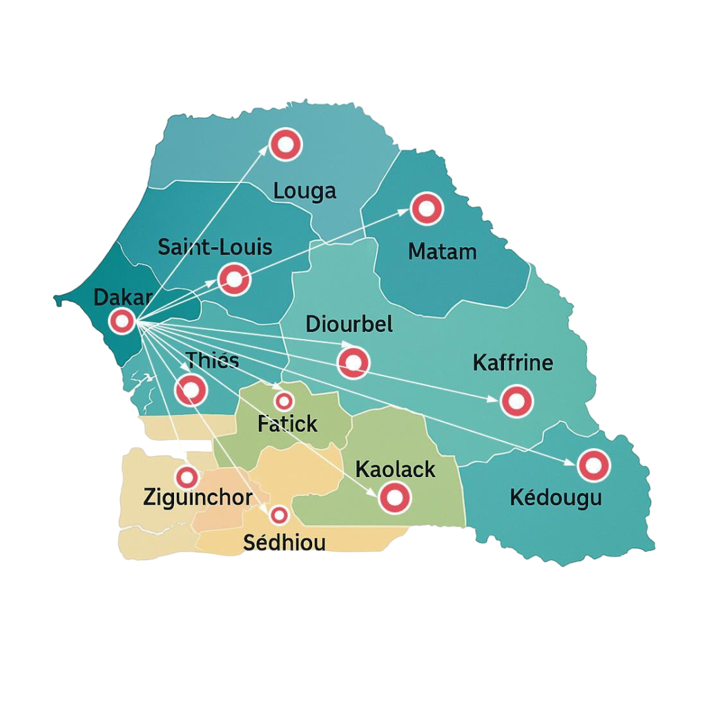 Le CNTS ne se limite pas à Dakar. Son action s’étend sur tout le territoire grâce à un réseau structuré de Centres Régionaux (CRTS) et de Postes de Transfusion Sanguine (PTS).